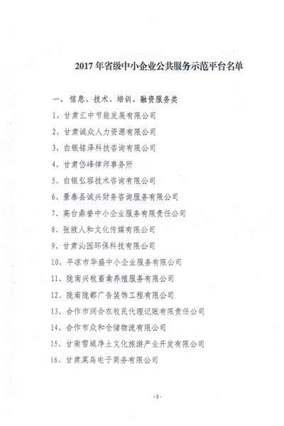 公司于2017年经甘肃省工信委评定为“省级中小企业公共服务平台”。平台围绕环境保护相关咨询服务、第三方评价、环境检测(包括排污单位污染源自行监测、环境影响评价现状监测、环境损害评估监测、清洁生产审核监测、企事业单位自主调查,自行验收监测、环境质量自动监测站和污染源自动监测设施的运行维护以及环境保护主管部门委托的环境监测活动)等服务内容,遵循“客观独立、公开公正、诚实守信和科学检测”的原则,坚持遵守国家法律法规,恪守职业道德,为客户提供真实、客观、准确的服务,为张掖市及省内其他地区的社会发展和经济发展提供确实可靠的环境评价依据。